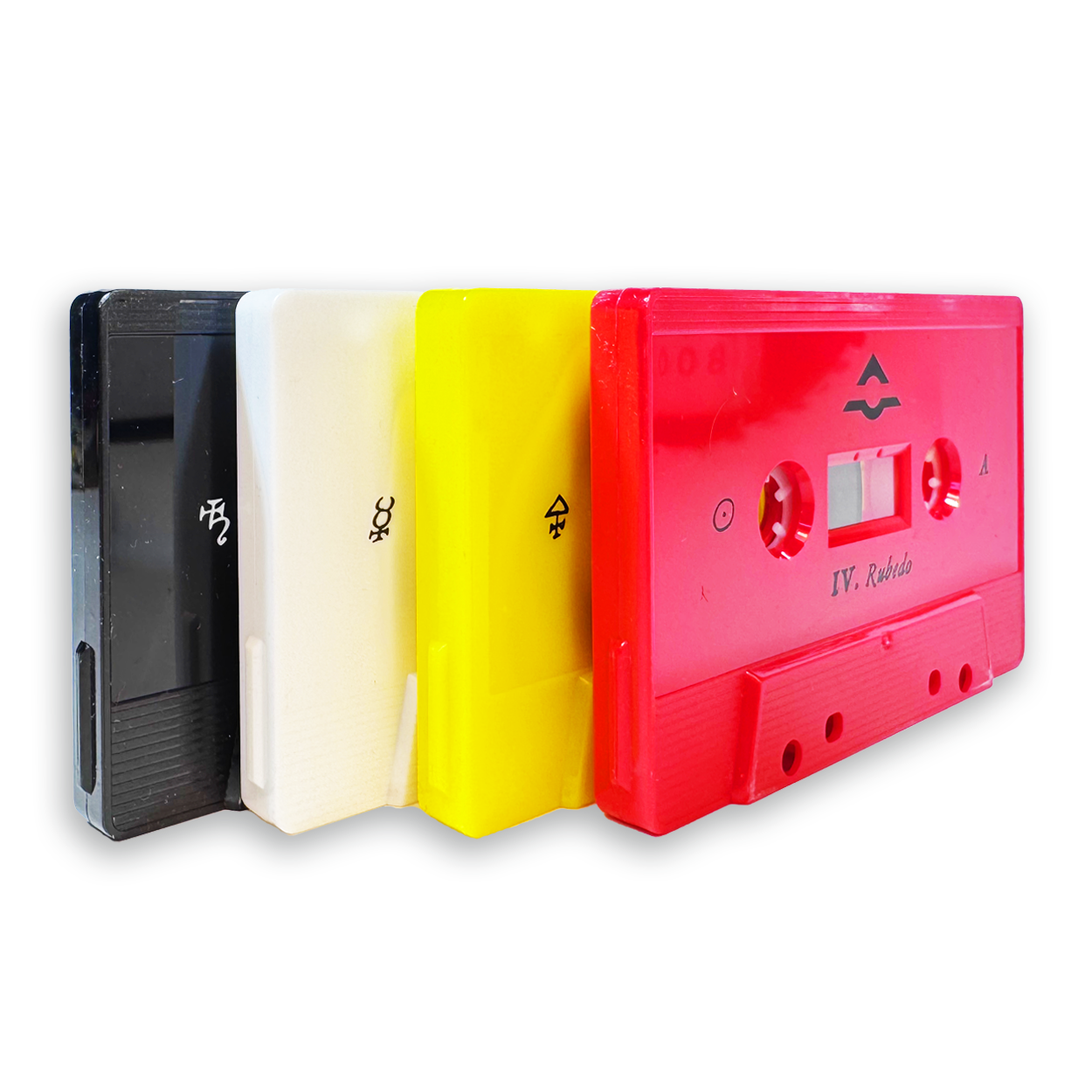The Great Work is a four-cassette interpretation of the Hermetic Magnum Opus rendered in sound and symbol. It follows the ancient alchemical progression: Nigredo, Albedo, Citrinitas, Rubedo. Each stage a descent and refinement. Each color a veil. Each tape a chamber of the Work.